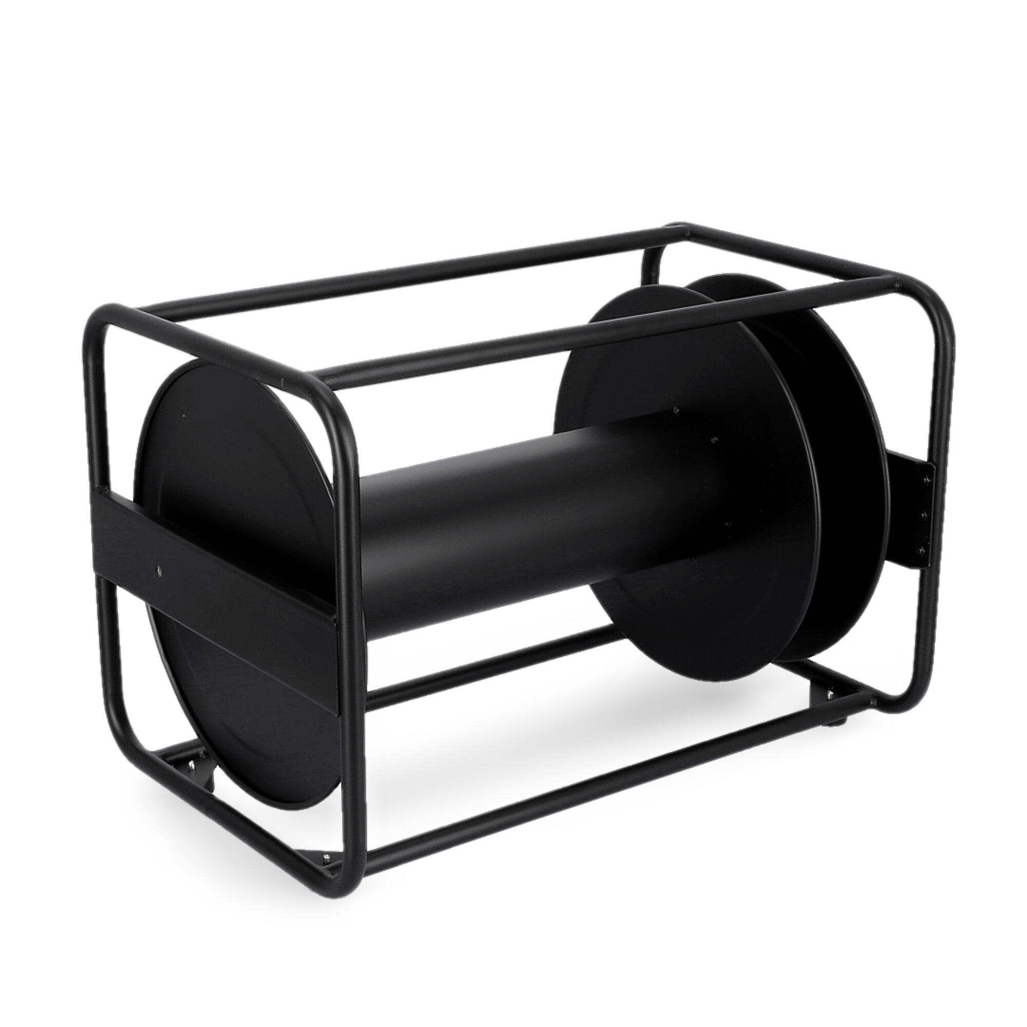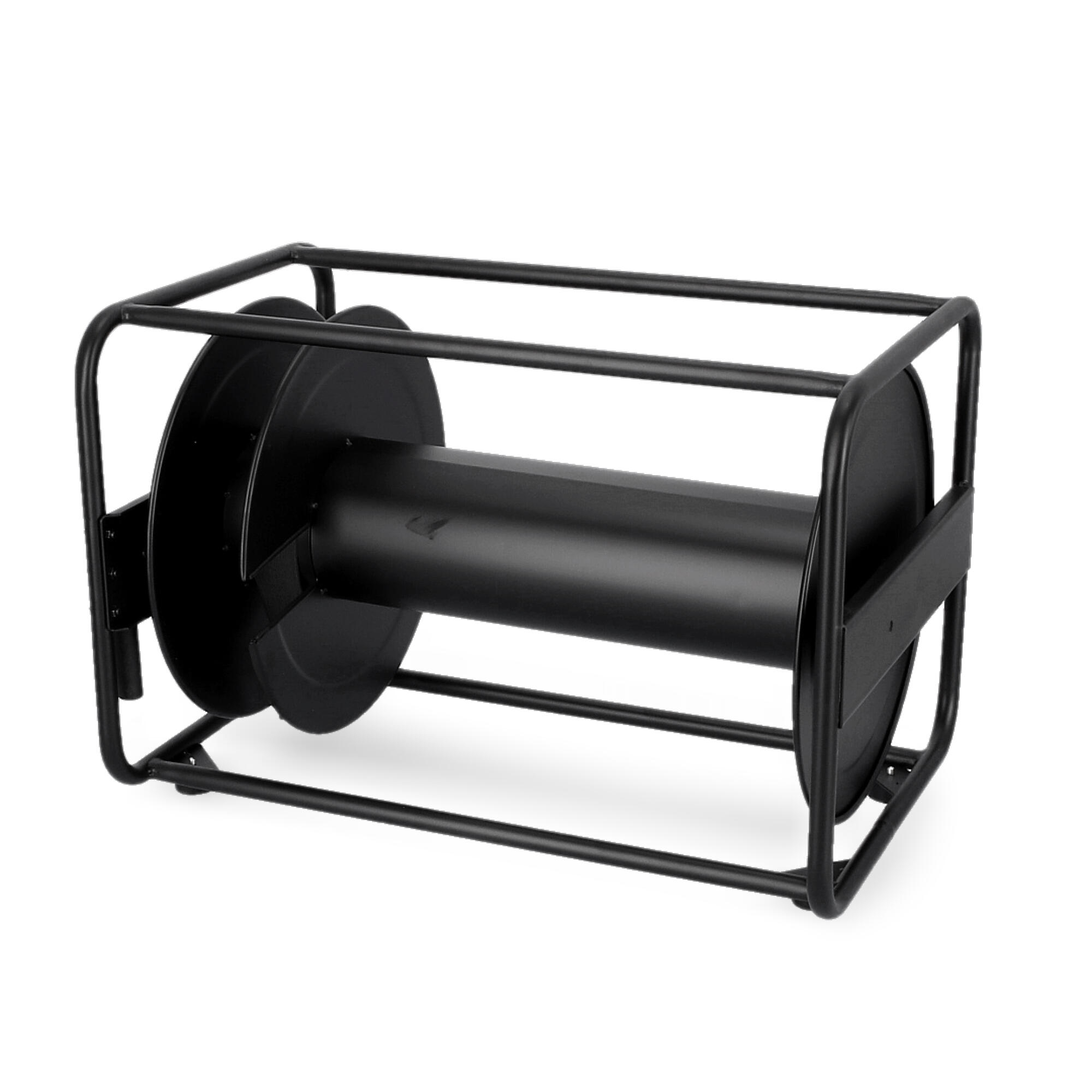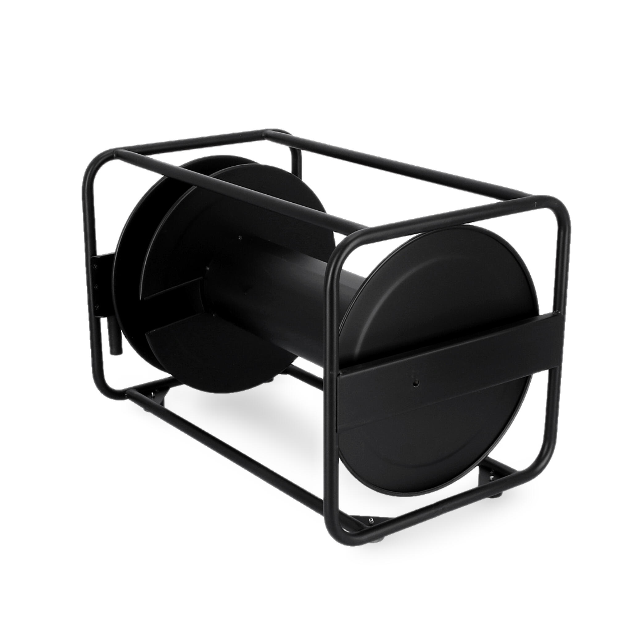 Bęben kablowy z blachy stalowej, czarnej, malowanej proszkowo. Do użytku w przypadku długich kabli o dużych średnicach. Obustronne łożyskowanie osi