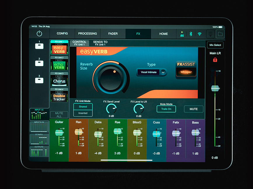 Jeśli chodzi o wyjścia, dostępne są dwa wyjścia miksu głównego oraz 6 wyjść do miksów monitorowych – wystarczająco dla całego zespołu – a także przypisywalne wyjście Alt.