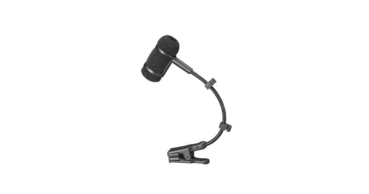 • Gumowy zacisk sprężynowy pewnie trzyma mikrofon na instrumencie, nie uszkadzając wykończenia