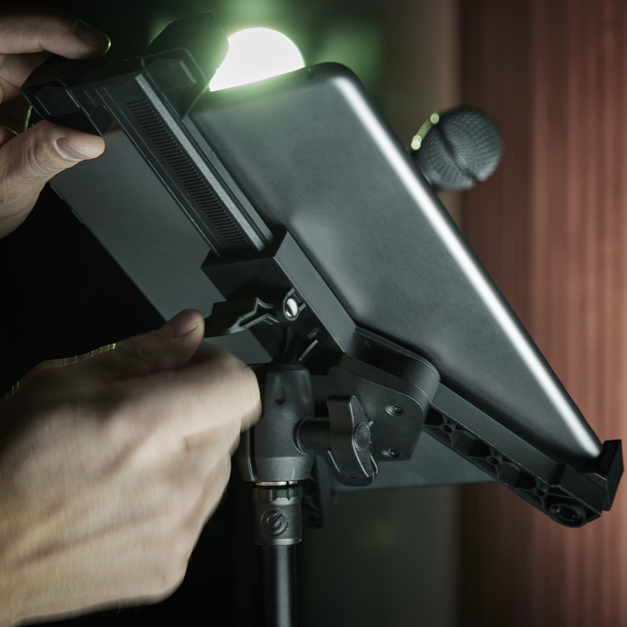 Dzięki temu praktycznemu narzędziu możesz przymocować i elastycznie ustawić wszystkie typowe tablety (o rozmiarach ekranu od 7,3" do 12,3") bezpośrednio na gwincie 5/8" statywu mikrofonowego.