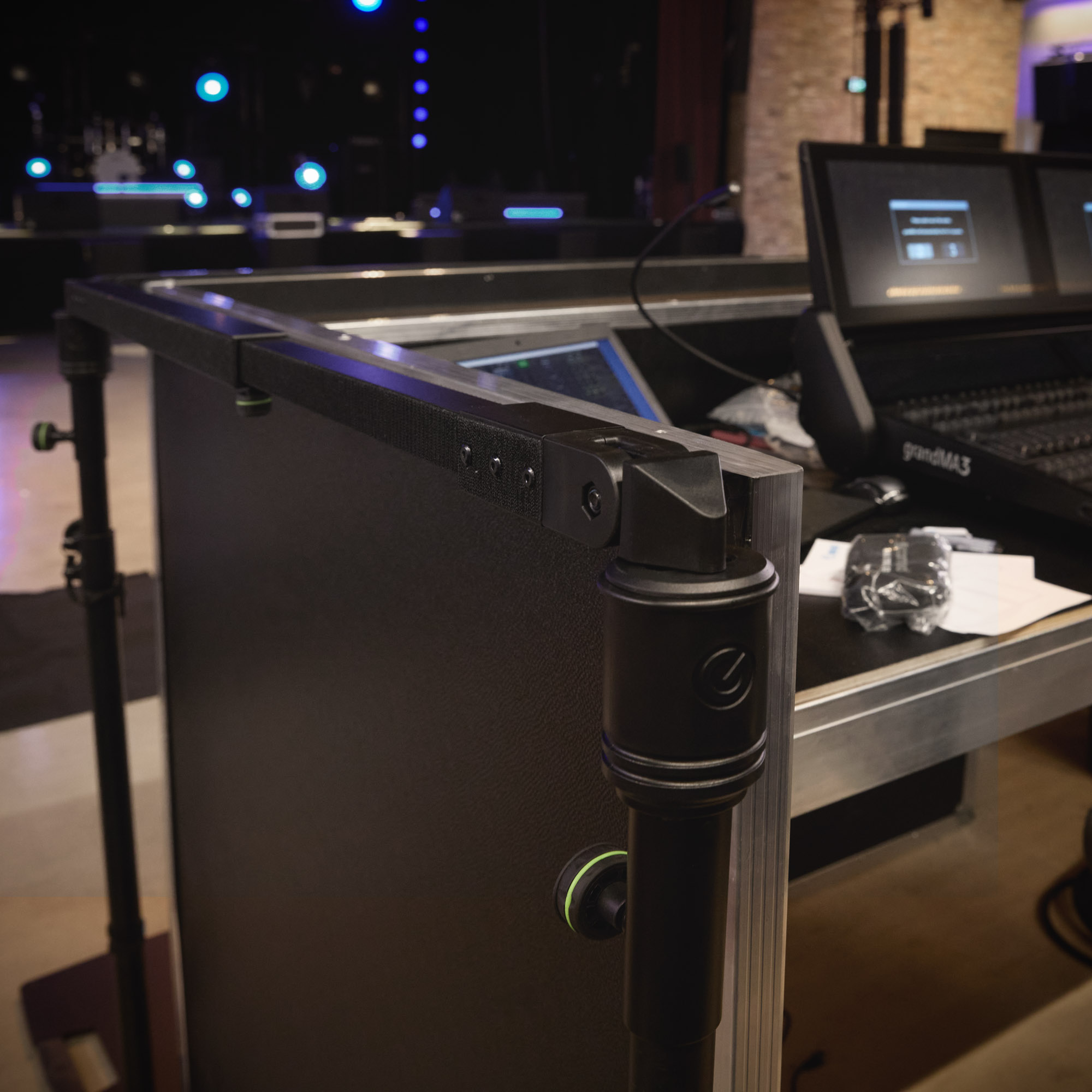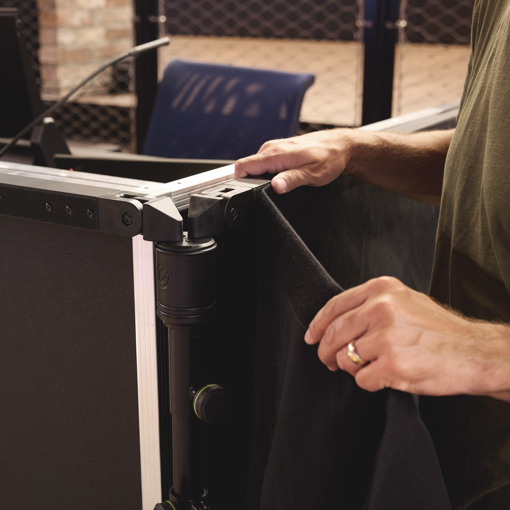System rurowych kurtynowych zasłon marki Gravity oferuje innowacyjne rozwiązanie dla muzyków, zespołów, techników eventowych, teatrów, wystawców i budowniczych stoisk. Umożliwia szybkie i wydajne tworzenie struktury pomieszczeń, dzielenie obszarów, zawieszanie ścian lub wytyczanie przejść. Wykorzystując adapter PAD A wraz z dostępną oddzielnie tyczką teleskopową PAD T S, standardowe statywy głośnikowe lub oświetleniowe z mocowaniami 35 mm mogą płynnie przekształcić się w kompleksowe konfiguracje rur i zasłon przy minimalnym wysiłku. Po prostu umieść PAD A na stojaku i przymocuj drążek teleskopowy, wkładając jego śruby montażowe w otwory adaptera. Opcjonalną zasłonę Molton można później bez wysiłku przymocować do poprzeczki.