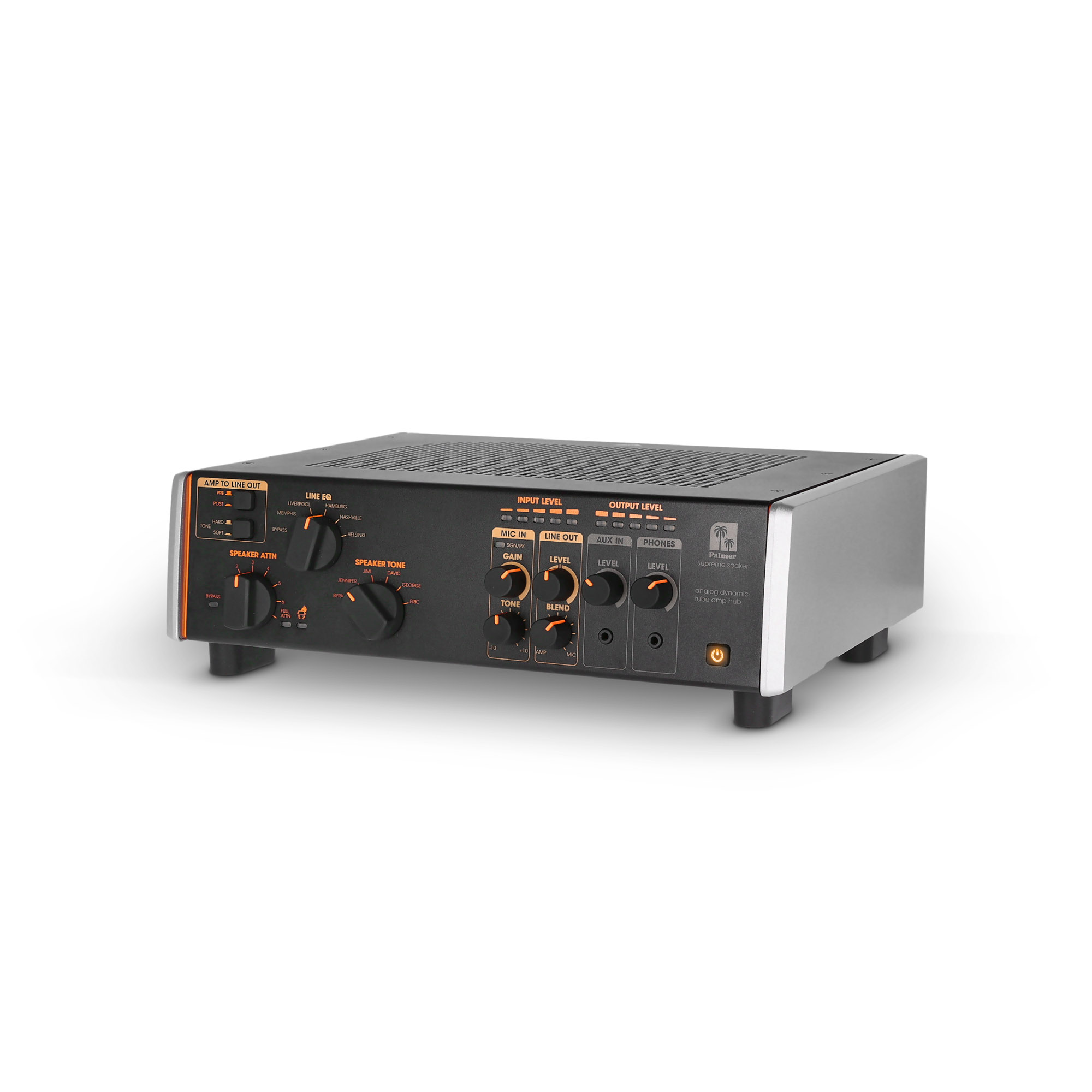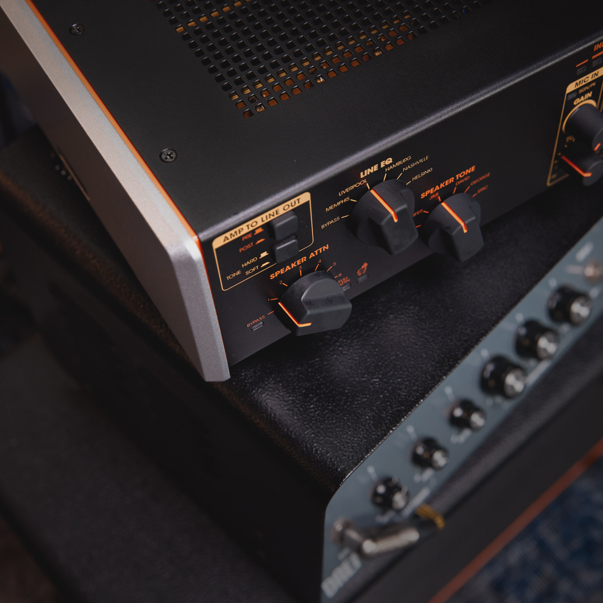 Elementy sterujące na panelu przednim: 7-stopniowe tłumienie głośników, Aux In Level, Hard/Soft Tone Selector, Line EQ (5 Voicings), Line Out Blend, Line Out Level, MIC Tone, Mic Gain, Phone Level, Pre/Post Switch (Amp to Line Out), Speaker Tone (5 Voicings)